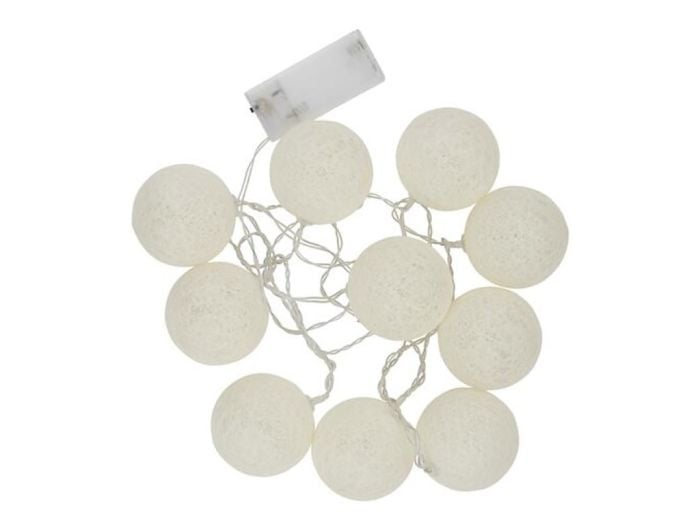 Girlandę można zawiesić lub udekorować nią szklaną wazę i dzięki temu stworzyć przytulną atmosferę. To nastrojowe oświetlenie składa się z 10 bawełnianych kulek świetlnych w białym kolorze. Kulki mają średnicę 6 centymetrów i są wyposażone w diodę LED.