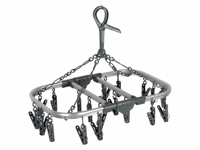 Suszarkę można łatwo zawiesić za pomocą mocnego haka i przymocować w wielu miejscach, takich jak linka do prania, drążek, hak, a także wewnątrz przyczepy kempingowej lub kampera. Wyposażona w 20 solidnych klamerek zapewnia wystarczająco dużo miejsca do suszenia skarpet, bielizny oraz innych drobnych elementów odzieży.