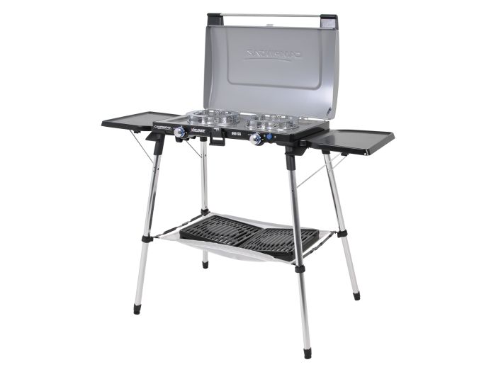 Campingaz Xcelerate 600 SG ma cztery teleskopowe nogi, które pozwalają ustawić kuchenkę na dwóch różnych wysokościach. Dwie półki można zamontować po obu stronach, aby uzyskać dodatkową przestrzeń roboczą. A pod kuchenką zawieszona jest poręczna siatka, w której można przechowywać przybory kuchenne.