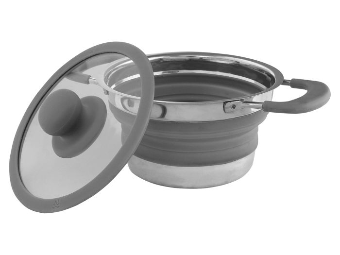 Garnek Eurotrail o pojemności 1 litra, z pokrywką, w kolorze szarym, można łatwo złożyć, co czyni go bardzo oszczędnym pod względem miejsca. Garnek wyposażony jest w przezroczystą pokrywkę z silikonowym uchwytem.