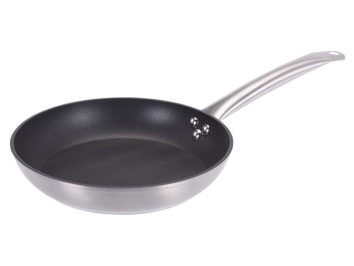 Patelnia o średnicy 24 cm to idealny rozmiar do smażenia, na przykład smacznego jajka lub smażenia ziemniaków i mięsa. Patelnia ma dno o grubości około 3 mm i nieprzywierającą powłokę.