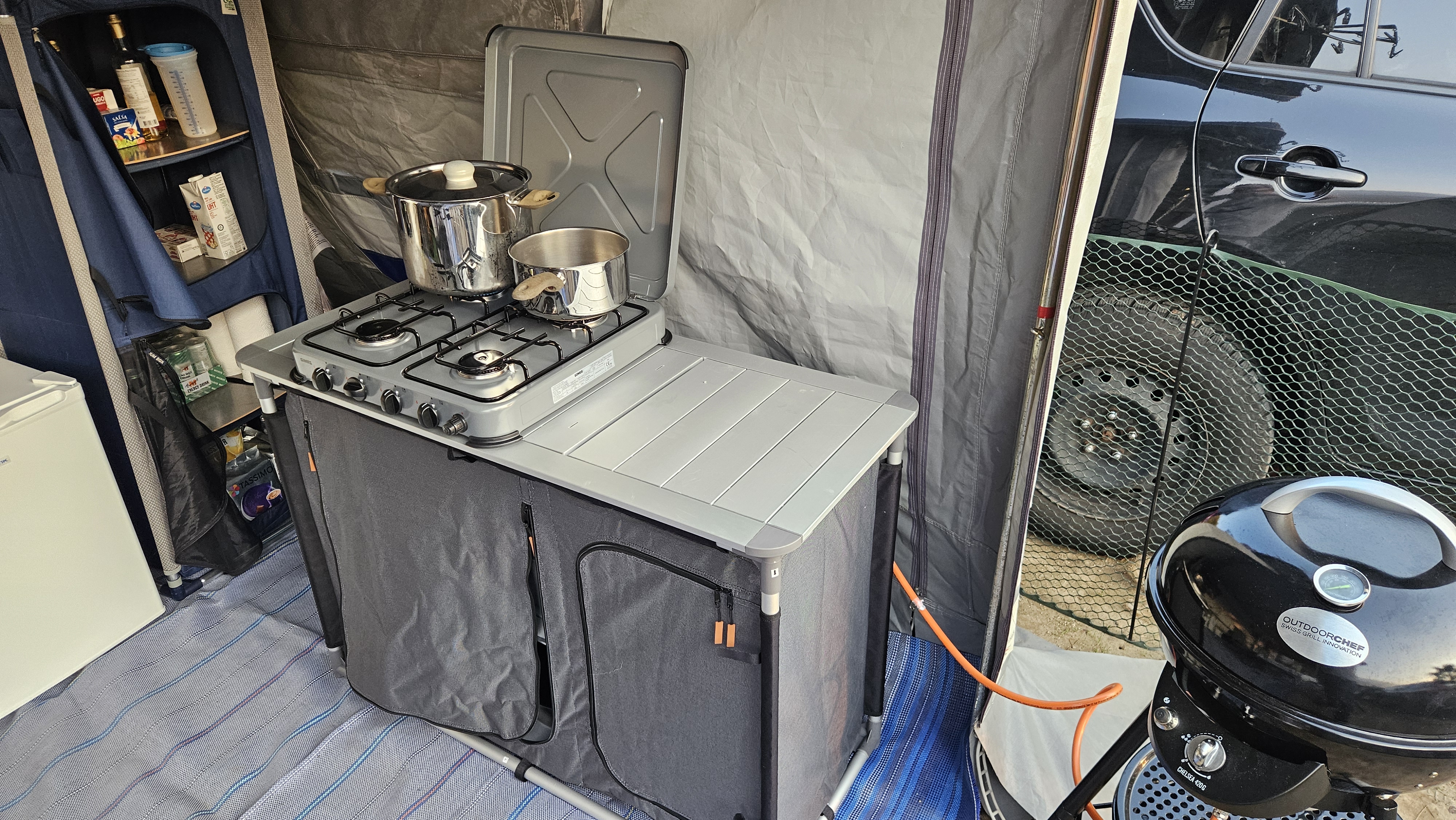 4-palnikowa kuchenka firmy Gimeg to bezpieczna kuchenka, która pozwala przygotować smaczne posiłki na kempingu, jednocześnie charakteryzuje się niewielką wagą. Kuchenka jest wyposażona w zdejmowane stabilne ruszty, które oferują wystarczająco dużo miejsca na cztery duże garnki. Antypoślizgowe nóżki gwarantują dodatkowe bezpieczeństwo i stabilność.