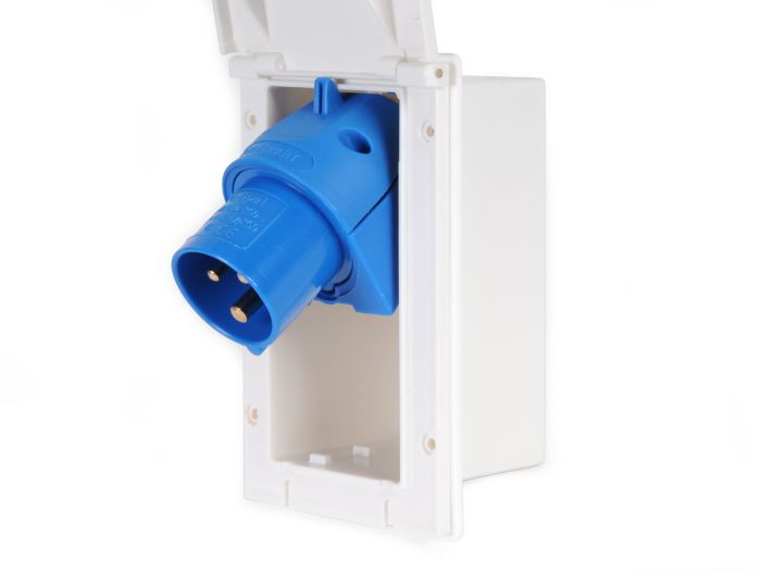 Gniazdo przyłącza ścienne CEE MPK może być wykorzystane do podłączenia 230V do przyczepy kempingowej, kampera lub łodzi. Osłona wtyczki kontrastowej jest zablokowana w skrzynce wejściowej, tworząc zabezpieczenie przed zachlapaniem.