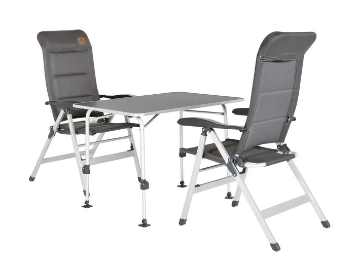 Ten zestaw Obelink składa się ze stołu kempingowego Obelink Abruzzo Superlight 100 oraz dwóch wygodnych krzeseł regulowanych Obelink Corsa – Grey. Jest to idealne rozwiązanie, aby za jednym razem mieć kompletny i komfortowy zestaw kempingowy.