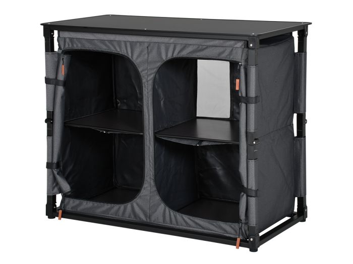 Obelink Alu Quick - Black ma cztery przestronne schowki, w których można przechowywać sprzęt kempingowy. Tył jest wyposażony w siatkę, która zapewnia dobrą wentylację szafki. Blat z aluminium jest odporny na wilgoć i wysoką temperaturę.