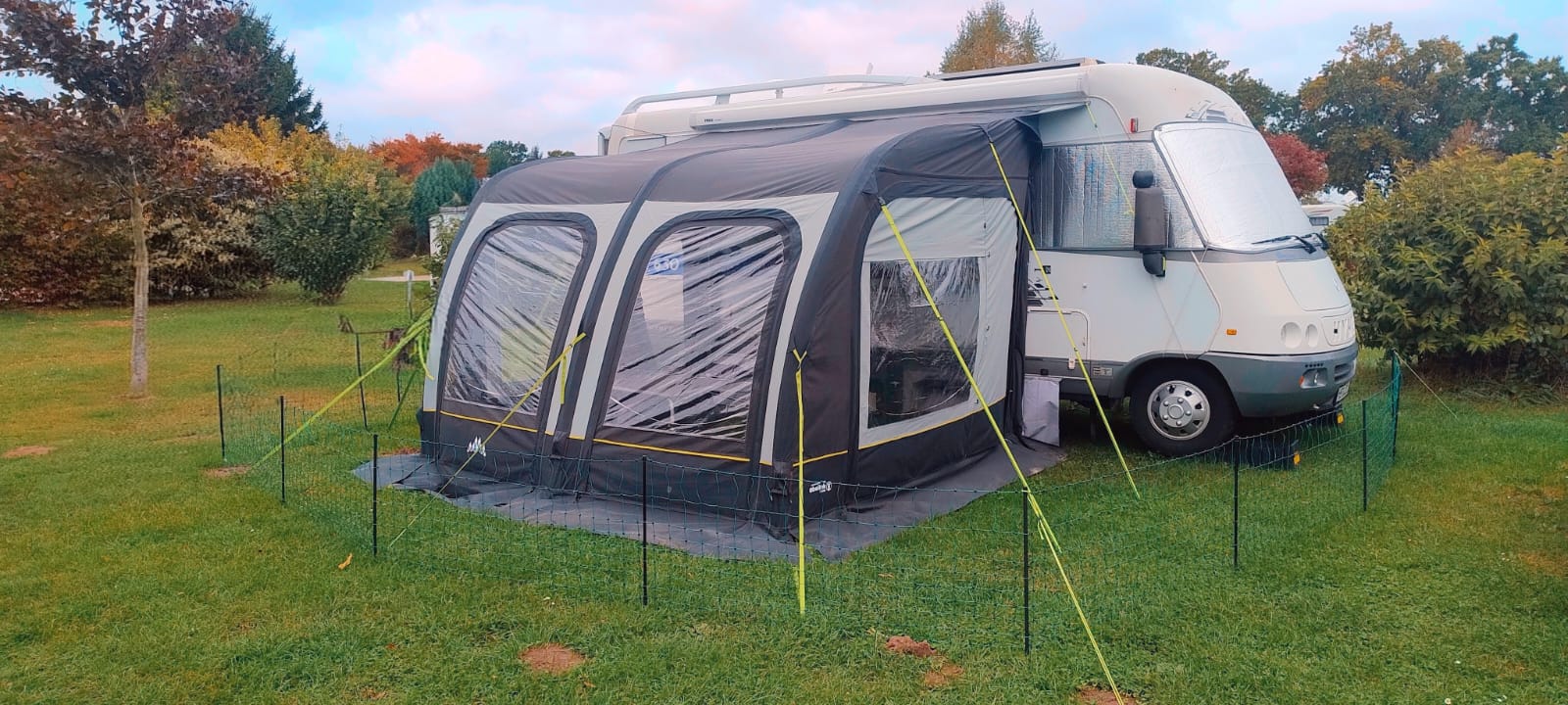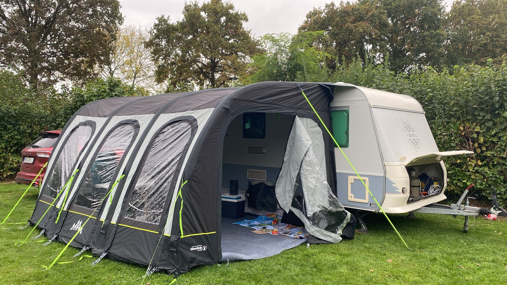 Obelink Ambassador 380 Easy Air Connected to przedsionek z pompowanym stelażem, który pasuje zarówno do przyczepy kempingowej, jak i kampera.