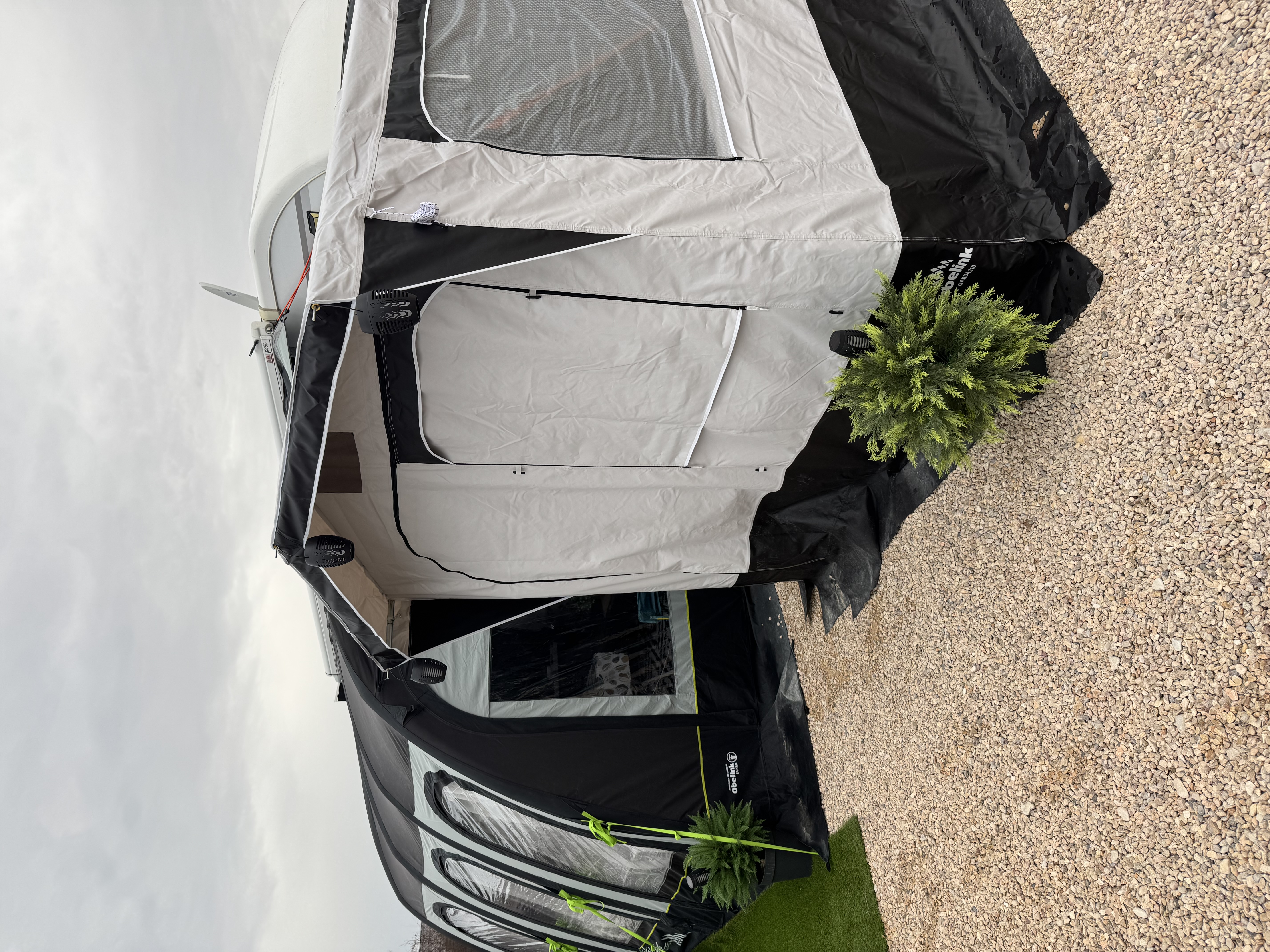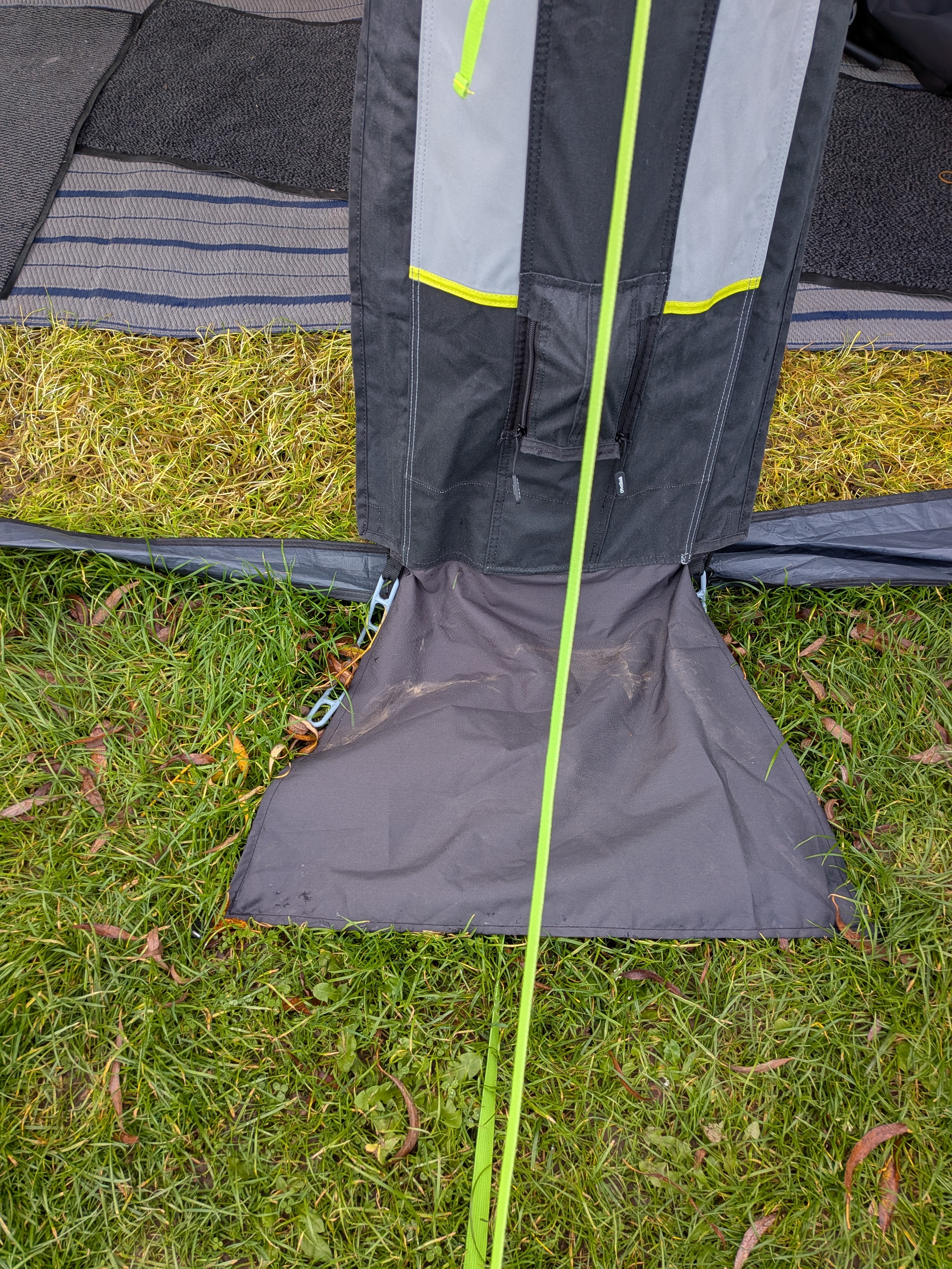 W przedsionku Obelink Ambassador 380 Easy Air Connected, obie ściany boczne oraz wszystkie panele drzwi w ścianie przedniej można całkowicie odpiąć. Gdy jest ładna pogoda, można łatwo przekształcić przedsionek w zadaszenie, odpinając wszystkie panele. W zależności od tego, jak zaparkowana będzie przyczepa kempingowa lub kamper, dzięki wielu opcjom można wybrać, które drzwi przedsionka będą głównym wejściem.