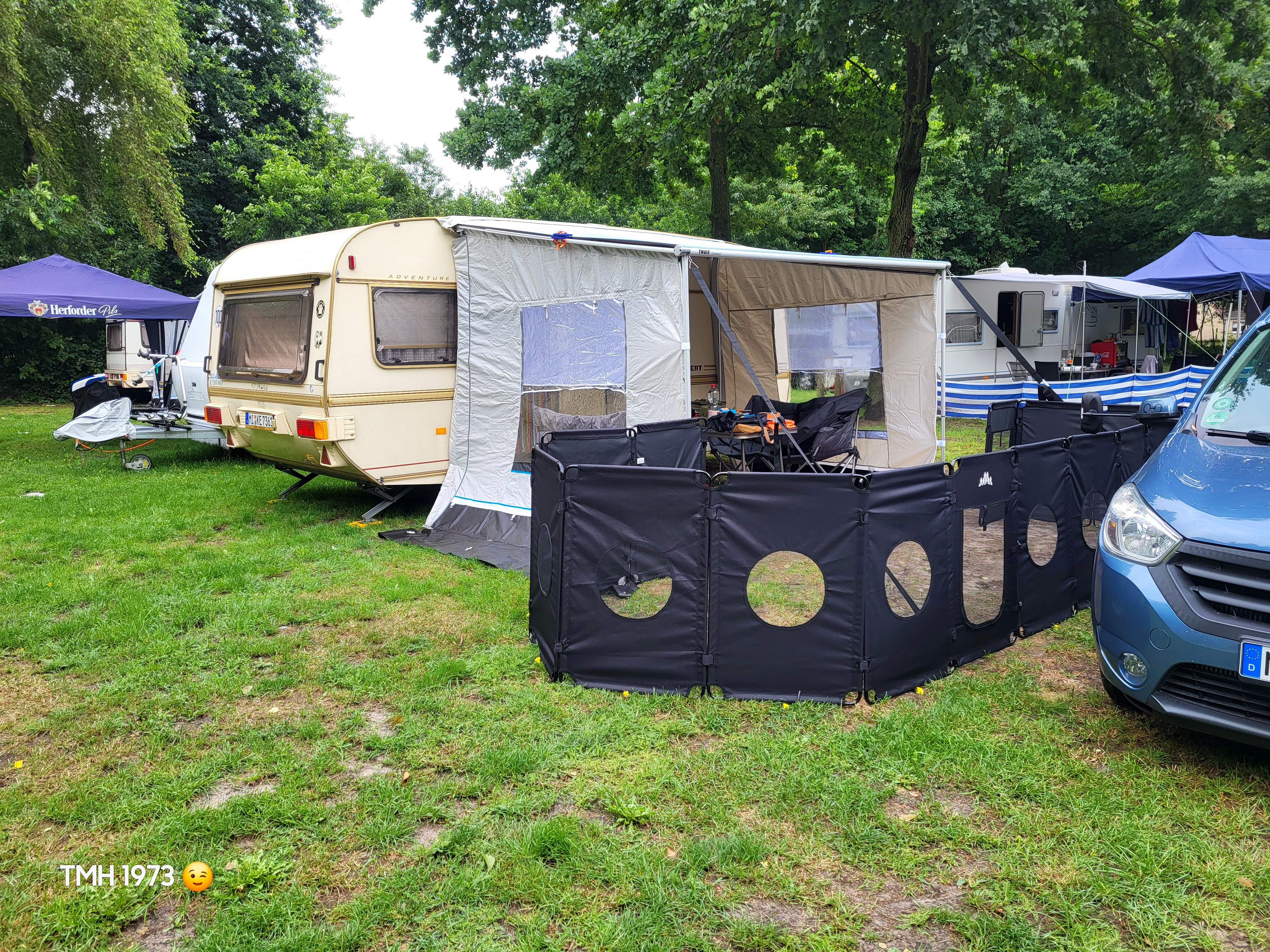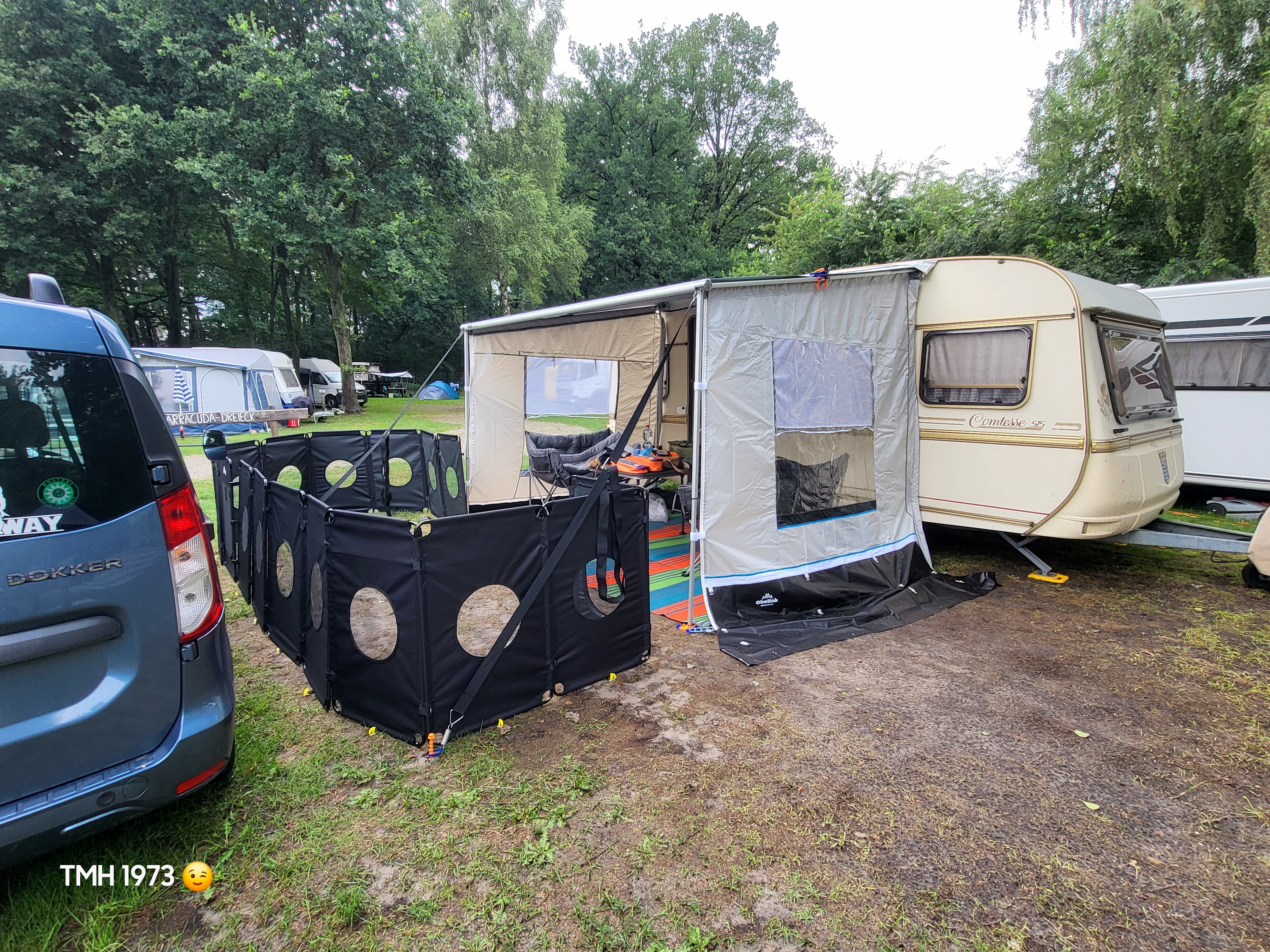 Wybieg dla psa można rozbudować o dwa dodatkowe panele boczne, aby uzyskać jeszcze więcej miejsca (dostępne osobno w naszym sklepie internetowym). Na zdjęciu z przyczepą kempingową widać ten składany wybieg dla psa Balou z dodatkowym zestawem paneli.