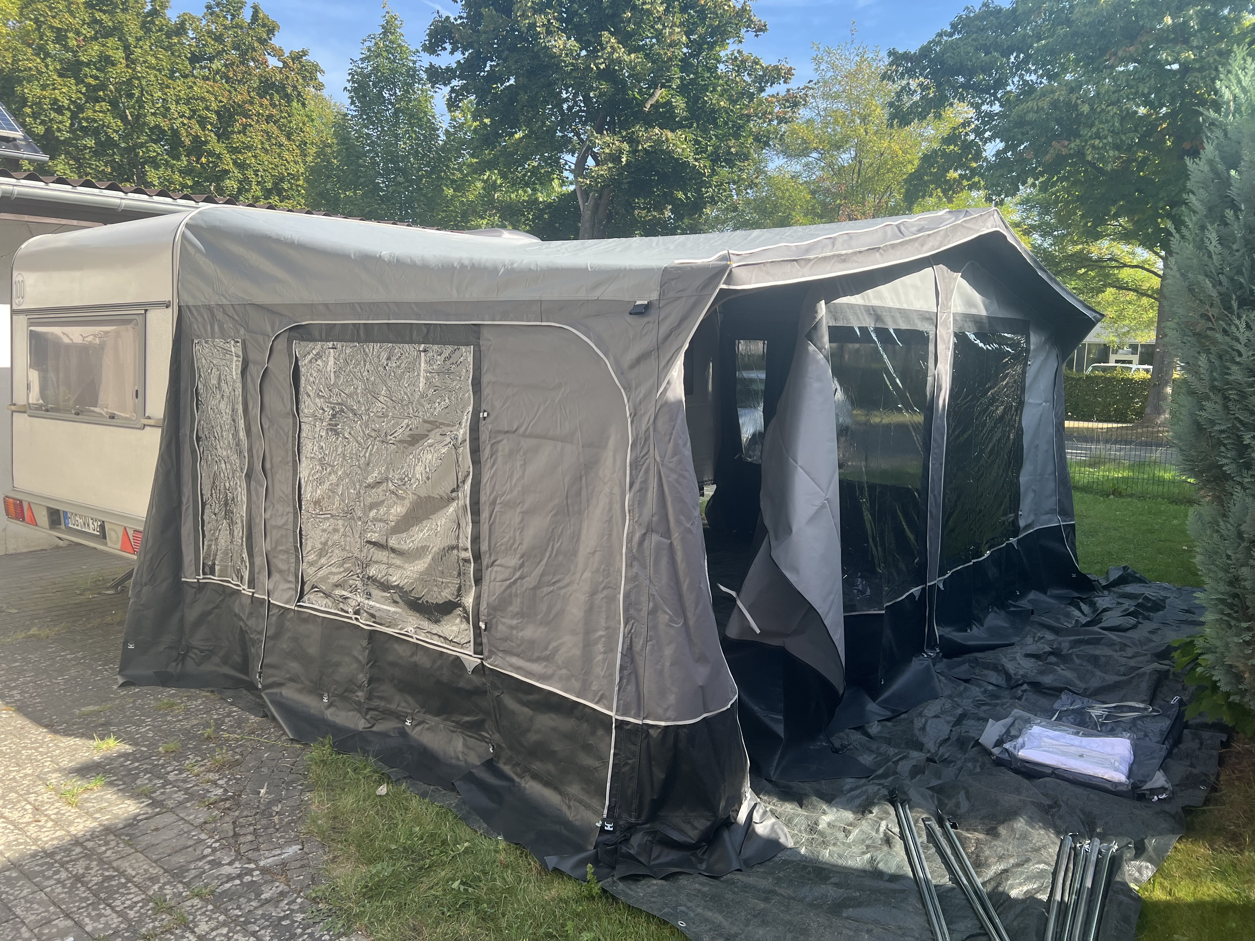 Przedsionek Capri 300 to wygodny, pełny przedsionek na cały sezon. Przedsionek wykonany jest z ciężkiego materiału PVC, który jest bardzo wytrzymały i może być rozstawiony na dłuższy okres obejmujący cały sezon.