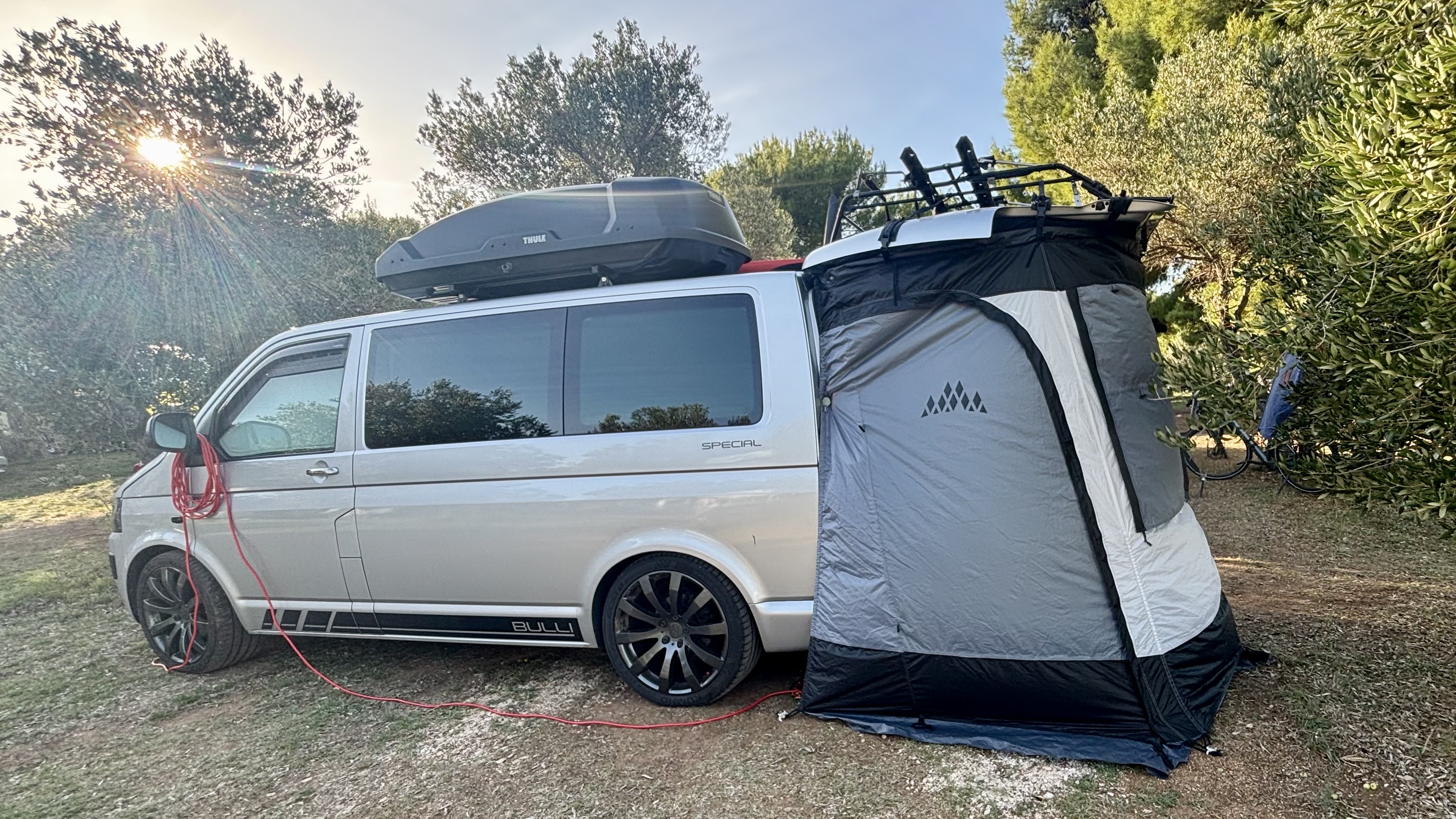 Wolnostojący namiot lub przedsionek może również stać bez busa lub kampera. Jest to szczególnie przydatne, gdy trzeba odjechać pojazdem, a nie chcemy zwijać namiotu.