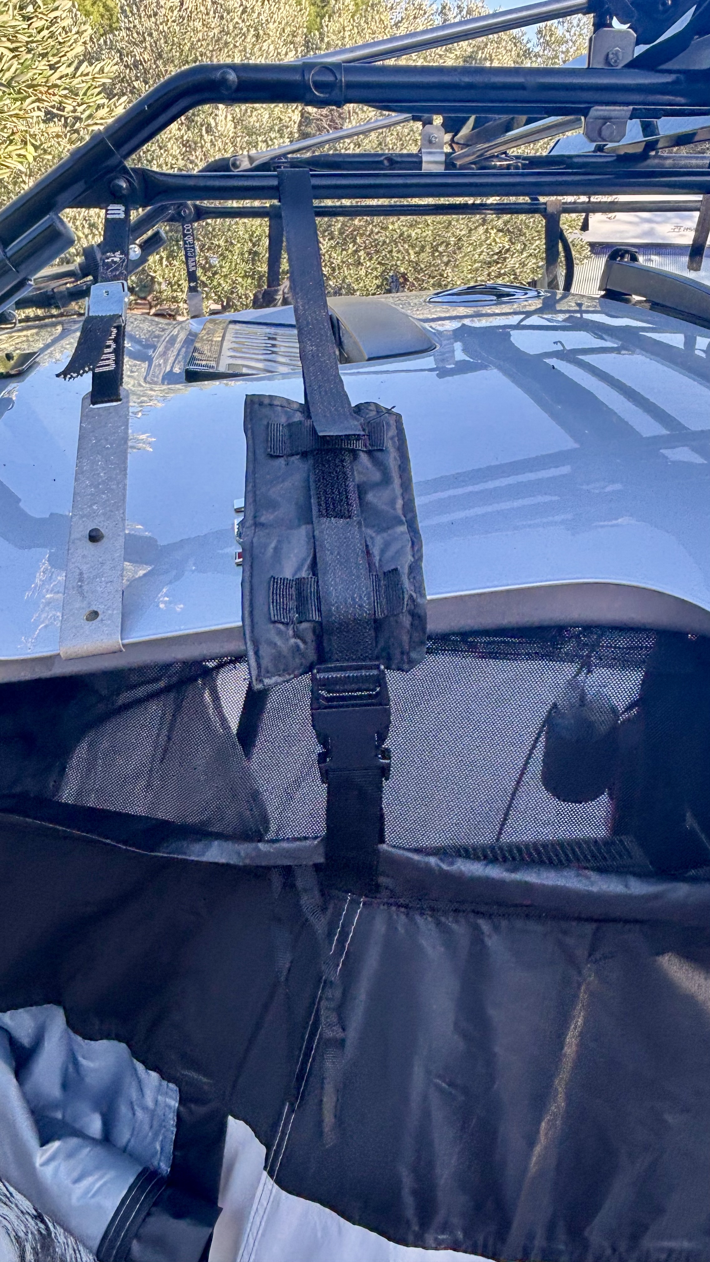 Wskazane są sposoby połączenia zakładki łączącej namiotu do busa lub kampera z pojazdem.