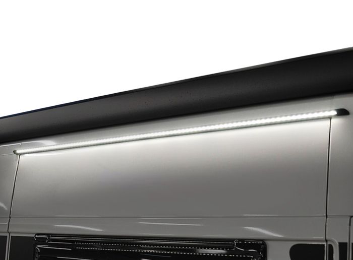 Oświetlenie Genoa firmy Obelink to wygodne rozwiązanie, aby odpowiednio oświetlić całe wejście do kampera. Oprócz oświetlenia, lampa ta działa również jako rynna przeciwdeszczowa, zapobiegając przedostawaniu się wody deszczowej przez drzwi przesuwne.