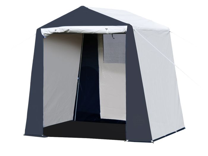 Tkanina PVC jest bardzo wytrzymała i ma długą żywotność. Dzięki temu wysokiej jakości materiałowi namiot kuchenny nadaje się również do długotrwałego użytkowania, na przykład podczas rozstawienia na cały sezon letni. Tkanina jest odporna na warunki atmosferyczne i można ją myć.