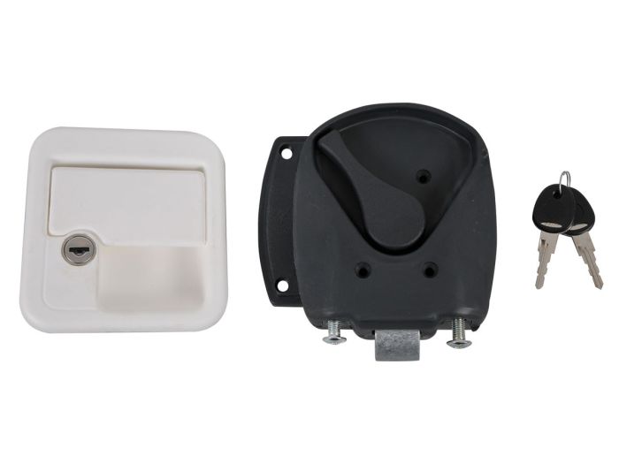 Kwadratowy zamek do drzwi Obelink dostępny jest w różnych kolorach, w tym w wersji white, dzięki czemu możliwe jest dopasowanie odpowiedniego wariantu do kampera lub przyczepy kempingowej.