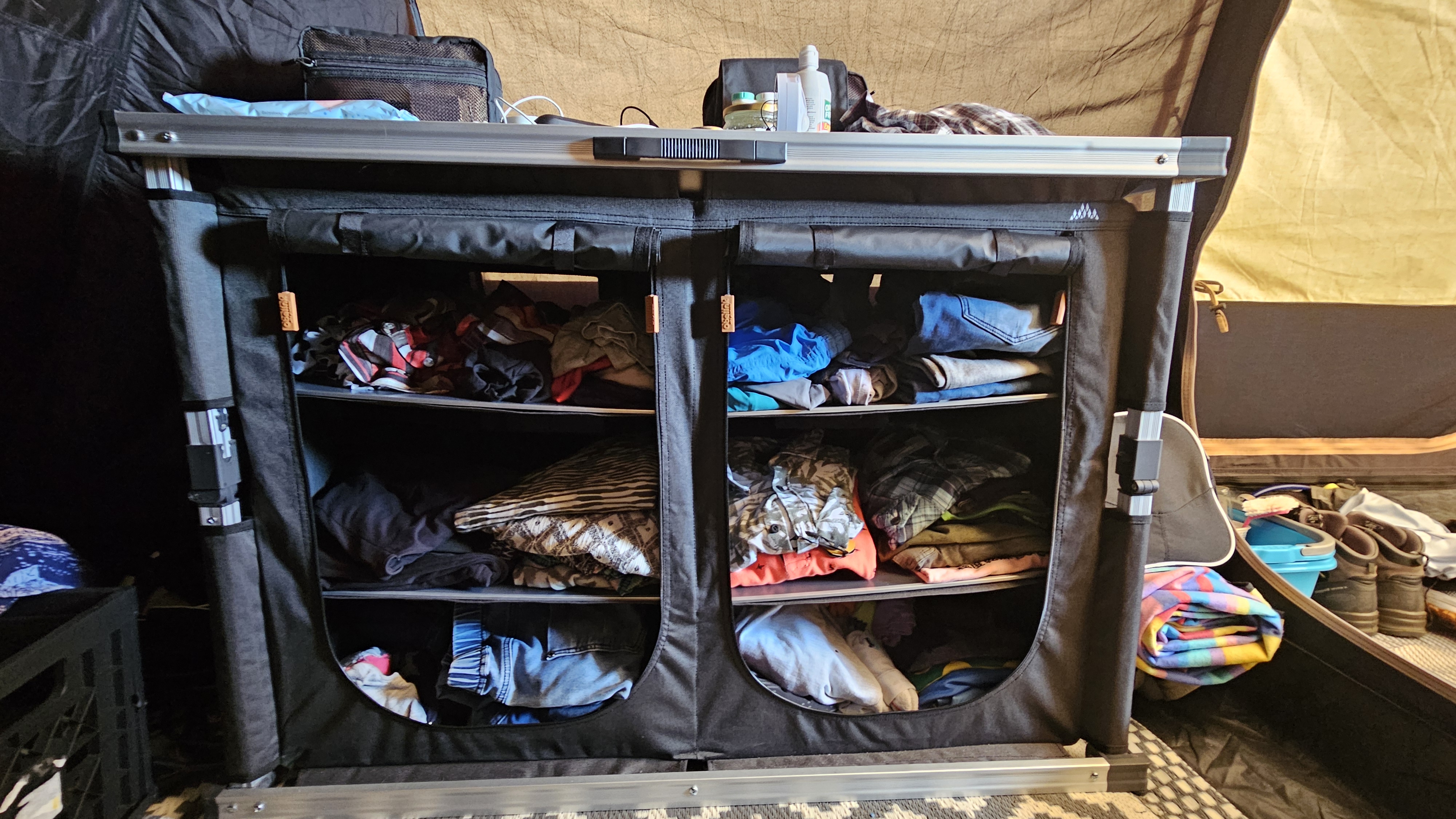 Szafka posiada sześć przestronnych schowków, w których można umieścić sprzęt kempingowy. Tylna strona jest pokryta siatką, co zapewnia dobrą wentylację szafki.