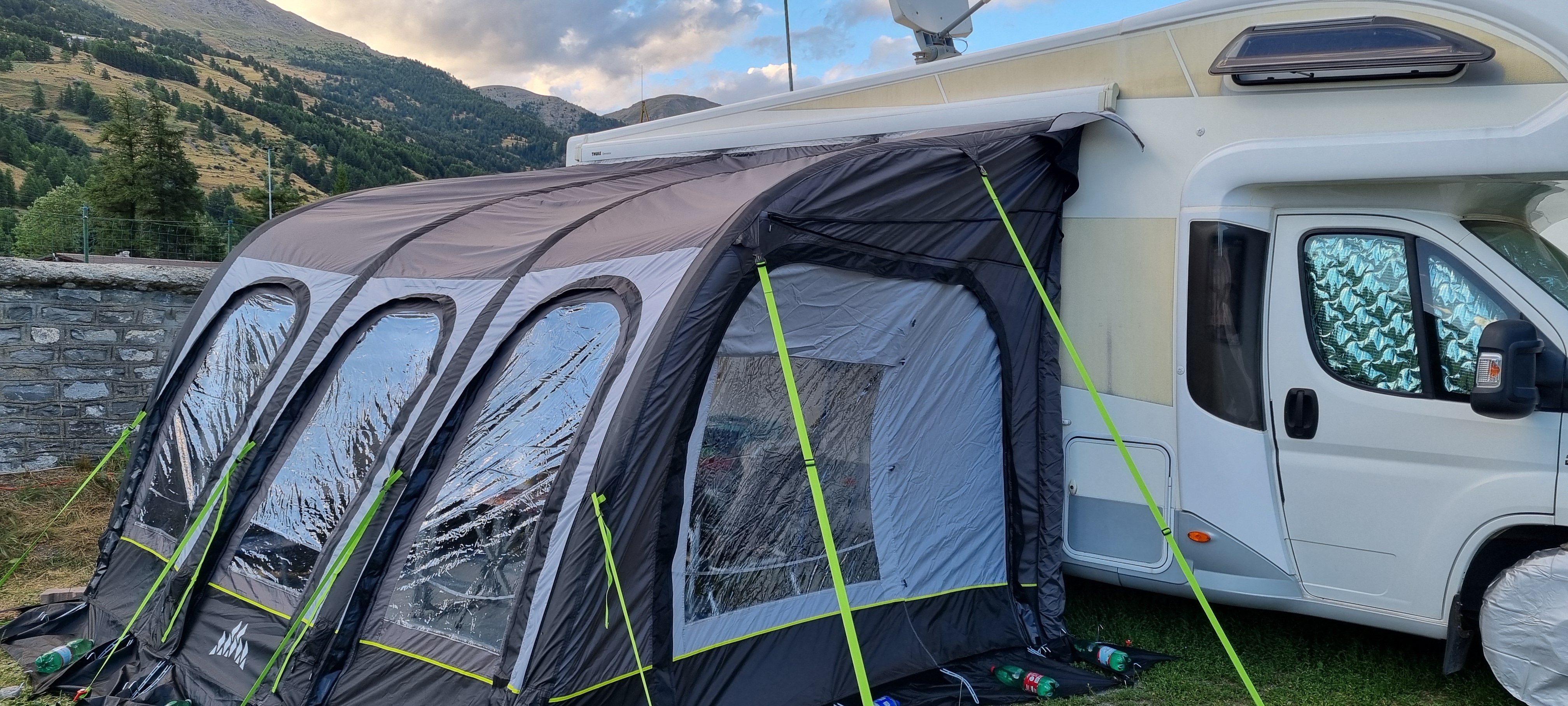 Obelink Monaco 380 Easy Air Connected to przedsionek z pompowanym stelażem, który pasuje zarówno do przyczepy kempingowej, jak i kampera.