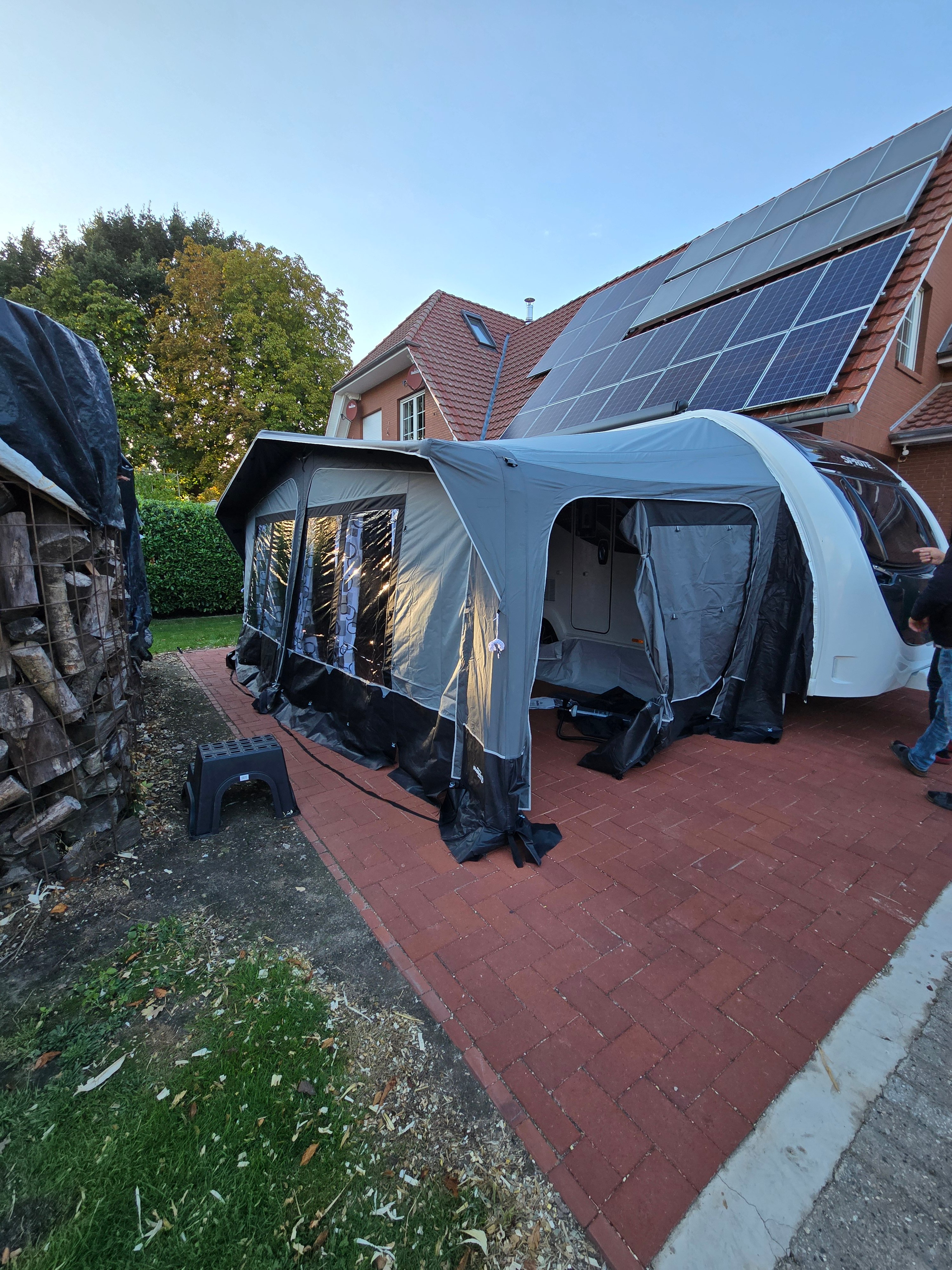 Wszystkie ściany przedsionka można całkowicie odpiąć, dzięki czemu dach można również wykorzystać jako zadaszenie przeciwsłoneczne podczas gorących letnich dni. Wszystkie ściany można lekko zwinąć, tworząc wygodne wejście. W ten sposób można wybierać spośród aż 4 różnych możliwości wejść do przedsionka. Obie ściany boczne posiadają okna składające się w połowie z siatki i w połowie z folii okiennej. Duże okna można zasłonić od wewnątrz dostarczonymi wraz z przedsionkiem zasłonkami. W górnej części kalenicy pod zadaszeniem znajduje się otwór wentylacyjny, który można otworzyć lub zamknąć za pomocą zamka błyskawicznego.