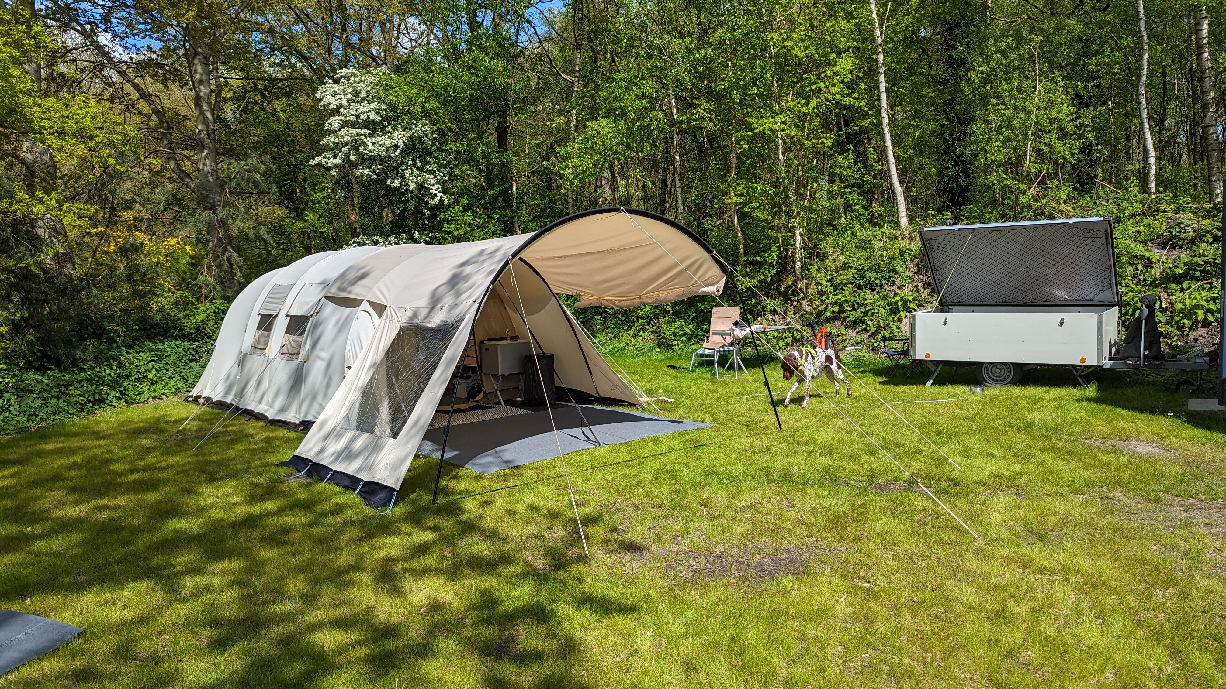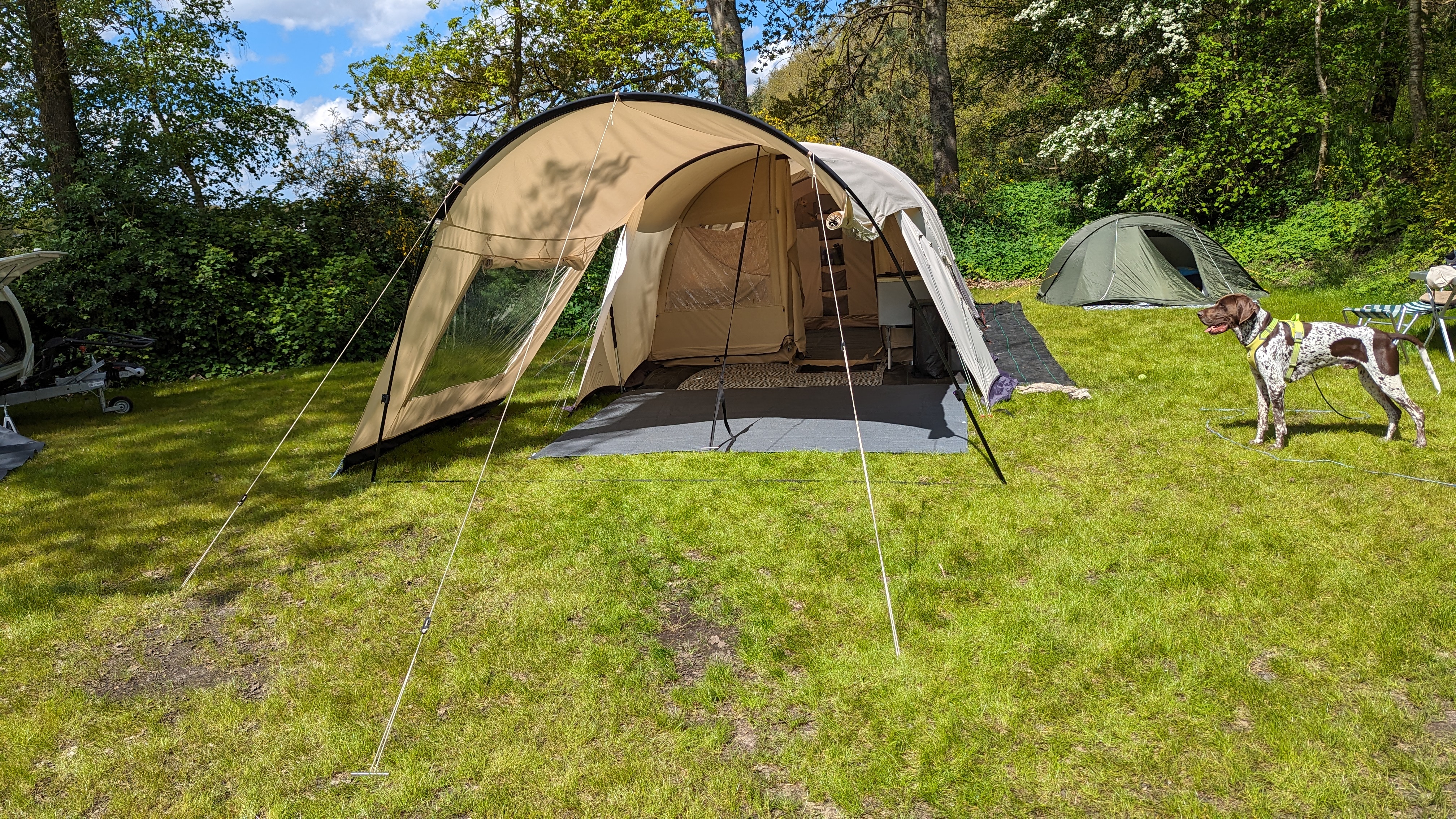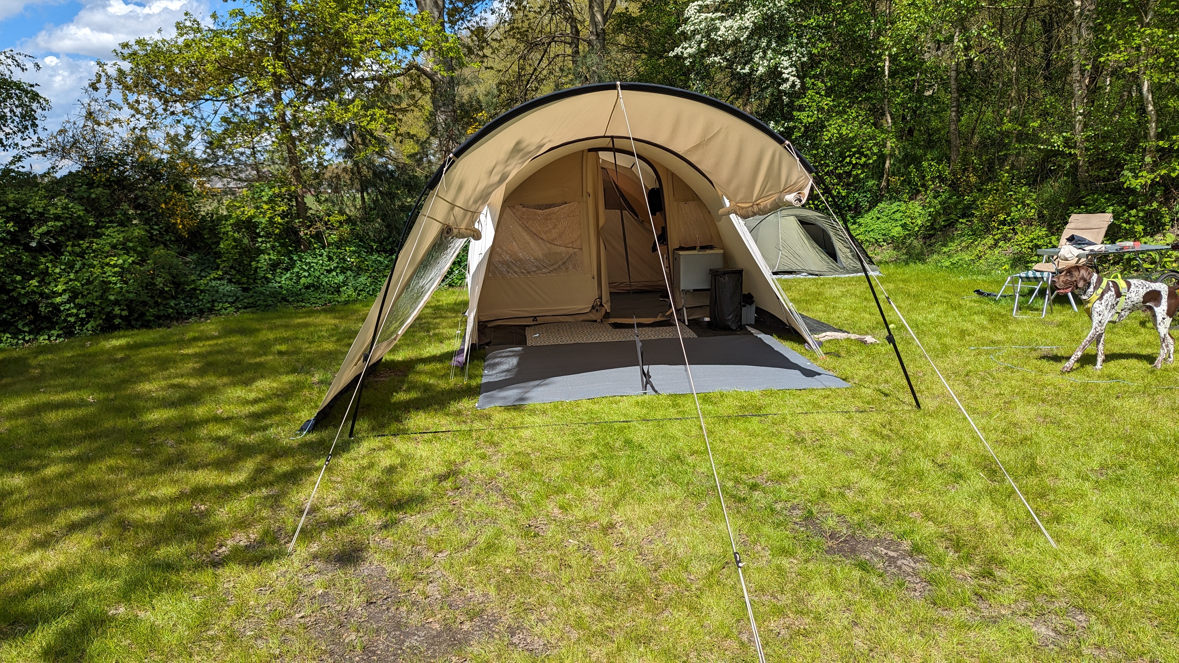 Tył zadaszenia jest wyposażony w długą klapę łączącą, którą można naciągnąć na prawie każdy namiot za pomocą dołączonych lin naciągowych. Ponieważ ściany boczne można zamocować na różnej szerokości, markizę można przymocować zarówno do wąskich, jak i szerokich namiotów.