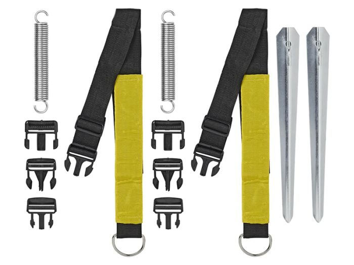 Zestaw składa się z dwóch solidnych nylonowych pasów napinających, które dzięki żółtemu kolorowi są szczególnie dobrze widoczne, 2 sprężyn, 2 solidnych śledzi i 2x 4 różnych klamer.