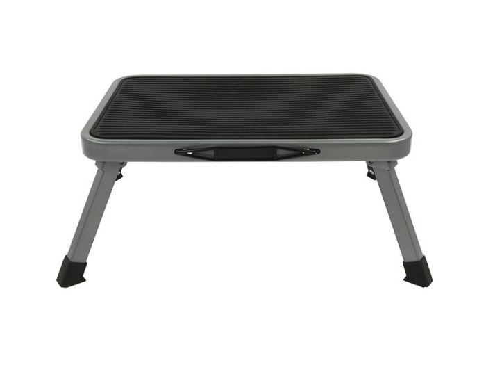 Składany stopień sprawdza się również podczas użytkowania w domu, magazynie lub innych miejscach. Wykonany jest z wytrzymałych stalowych rurek i wyposażony w antypoślizgową matę na stopniu. Podest przeznaczony jest do maksymalnego obciążenia 150 kg.