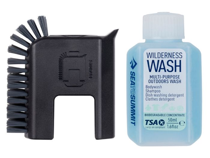 Zestaw Sea to Summit składa się ze szczoteczki wielkości dłoni i biodegradowalnego środka myjącego Wilderness Wash.