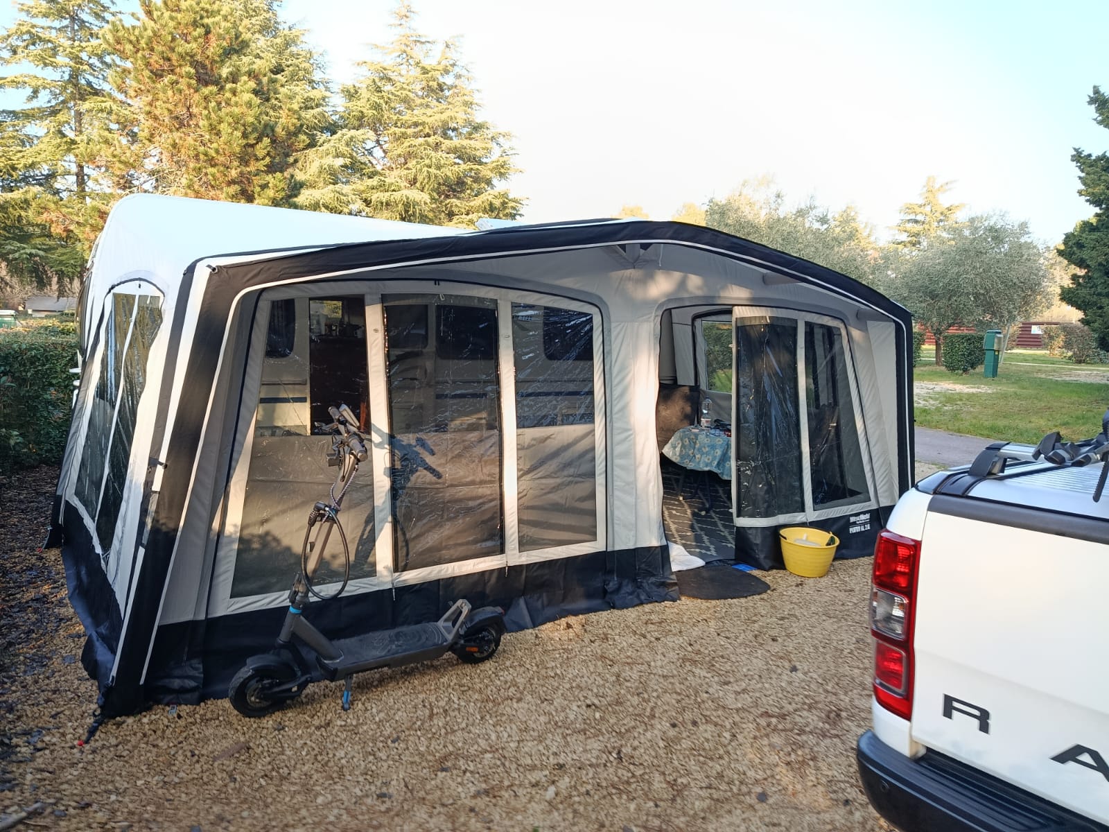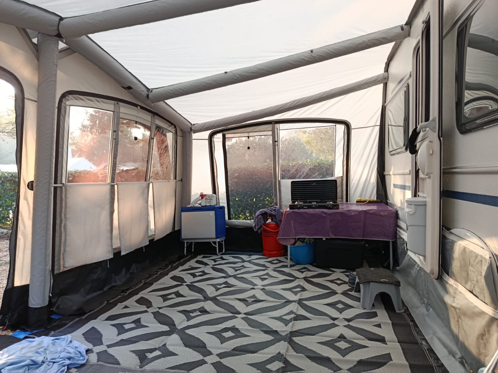 Przedsionek Westfield Pluto XL 2.0 w rozmiarze 9 to wyjątkowo głęboki przedsionek do przyczepy kempingowej ze stelażem w postaci tub powietrznych, o obwodzie od 981 do 1015 cm.