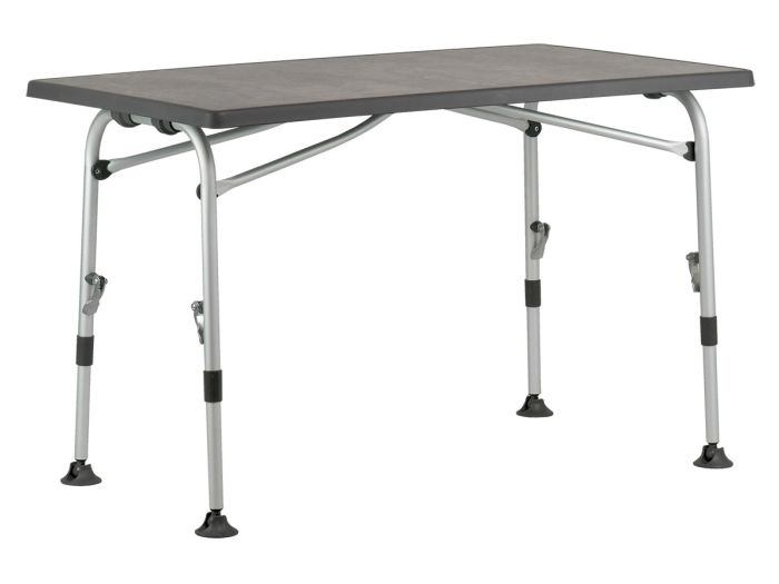 Ten stół kempingowy jest bardzo stabilny dzięki bezstopniowo regulowanemu stelażowi i dużym stopkom nóg. Dzięki temu stół jest stabilny na każdej powierzchni. Regulacja nóg stołu oraz mechanizm blokujący części dolnej wykonane są z aluminium, aby ciężar stołu był jak najmniejszy.